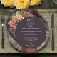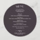 A round dinner menu card on a dramatic purple brown background and menu details in chic white lettering with beautiful watercolor flowers in pink and gold on the back. Perfect for a modern wedding reception, wedding rehearsal dinner, anniversary party or any special event with a sit down dinner. MATCHING items in our store.