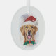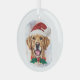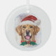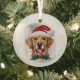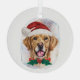Elegant Watercolor Golden Retriever Christmas Glass Ornament features a watercolor of a Golden Retriever with a red Santa Hat, a red Christmas collar.