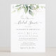 Beautiful bridal shower invitation featuring watercolor eucalyptus and gold leaves.