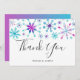Winter theme wedding thank you card with watercolor snowflakes. The text says "thank you" in script font with the newlywed's names under it. The back of the card is pink and blue ombre.