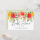 Bright red yellow and green watercolor florals along the top with script and modern font bridal shower invitation. Back is solid green with the shower information.