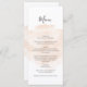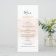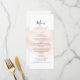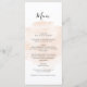 This design features a splash of elegant peach watercolor. This simple design takes advantage of the natural watercolor splash brush stroke in order to emphasize the text. The wedding date is framed in black and white. The combination of the peach colour together with the black and white colours creates a sophisticated, trendy and chic style. Elegant wedding menu card design with modern elements. The modern setup of the typography gives it a distinct style. Matching wedding invitations and other stationery items are also available.