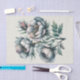 A meticulously illustrated bouquet. The flowers are predominantly in shades of green and grey, with intricate details highlighting their petals and stamens. There's a distinct red bud on one of the stems, contrasting beautifully with the cool tones of the rest. The leaves and stems are depicted with varying shades of green, giving depth and dimension to the composition. The entire arrangement is set against a glacier-white background, allowing the colours of the flowers to pop and the details to be visible.