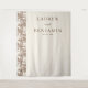 This is a minimalist style image featuring an elegant wedding invitation design. The composition includes the names "Lauren and Benjamin" in a sophisticated, serif font, with a date below it. The left side of the card showcases a delicate brown-toned floral pattern that adds a touch of vintage charm to the overall look. The soft beige background creates a warm and inviting atmosphere, making this perfect for couples who appreciate classic elegance and understated beauty.