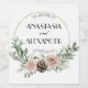 Elegant wedding label for wine. In a gold Christmas frame, gold wreath with pine cones and roses on a white background.