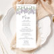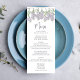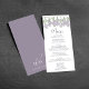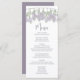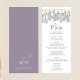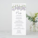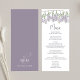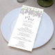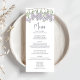 This design features a wedding menu card with an elegant calligraphy script, with a classic lilac lavender floral design with a classic dinner meal course
