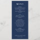 This is a classic style image featuring an elegant wedding menu card with a navy blue background and white text. The layout is clean and sophisticated, listing starters, salad, main course, and dessert options in a simple yet refined manner. It exudes a sense of formality and celebration, perfect for capturing the essence of a special occasion like Lauren & Benjamin's wedding on May 23, 2026. The colour scheme adds to its timeless charm, making it both inviting and memorable.