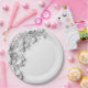 A collection of intricately designed white paper quilling flowers and swirling patterns on a light silver background.