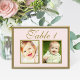 Elegant and unique custom wedding table number cards feature childhood photos of the bride and groom at an age that corresponds with the table number. To customise: type in the table number, click "change" by the default photos to upload your own digital or scanned photos, and add that individual table number card to your shopping cart. Repeat for all of the table numbers that you need. Antique gold script custom text on a pale pastel ballet pink (can be customised) background colour.