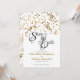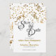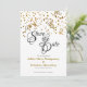 This black, white, and gold save the date announcement features a gold confetti back and top front border over a white background. Fill in the personalise text fields, remove any text and/or click customise to select a typeface colour, size, and style your prefer.
