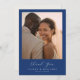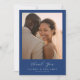 This is a romantic style image featuring a beautifully captured moment of two individuals sharing an intimate embrace, bathed in the warm glow of golden hour light. The composition highlights their joy and connection, with soft focus enhancing the dreamy atmosphere. Set against a deep blue background, the elegant script adds a touch of sophistication to this heartfelt thank you card for Lauren & Benjamin from Atlanta, Georgia. It's perfect for expressing gratitude while celebrating love and unity.