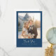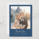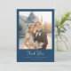 This is a romantic style image featuring a beautifully dressed couple in wedding attire, standing together with warm smiles. The background showcases an elegant church and lush greenery bathed in soft golden sunlight, creating a serene and joyful atmosphere. The bouquet of pastel flowers adds a touch of delicate beauty to the scene. The deep blue border frames their happiness perfectly, while the "Thank You" message at the bottom adds a personal and heartfelt note. Ideal for expressing gratitude after a special day, this card captures love and appreciation.