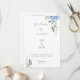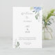 Chic and elegant blue hydrangea flat card wedding programs, featuring a beautiful floral design, a welcome message for guests, your names and date and editable program details at the back. The design is set against a white background, both back and front with text in grey. Space is available to add more wedding party names if required.