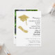 This simple white, black and gold graduation invitation for the class of 2025 graduate is decorated with a grad's hat and diploma illustrations on both sides and has a template to upload custom photo. The template text makes it easy to personalise the invite with the graduate's name, year, school, date, place, and RSVP data.