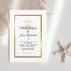 Invite your guests to help you celebrate your special day with this elegant invitation featuring modern script, black and gold text including an artistic palm tree and metallic gold foil frame on the front of the card. A white background is on the front and back.