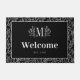 Monogrammed door mat with your initial flanked by hand-drawn greenery against a black background with a patterned border with more greenery in black and white. Welcome in a bold font. Add the year your family was established. All text is customisable.