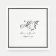 These elegant personalised wedding paper napkins have a classic black calligraphy script with your monograms, names, and wedding date on a simple white background bordered with a thin black and white frame. Designed by artist Susan Coffey.