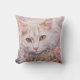A pillow with a lovely illustration. A long haired white cat looking regal and elegant. Surrounded by pink flowers, gold and diamond jewellery.