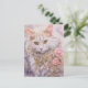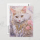 A postcard with a lovely illustration. A long haired white cat looking regal and elegant. Surrounded by pink flowers, gold and diamond jewellery.