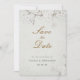 Make a memorable first impression with this romantic "Save the Date" card. The design features graceful branches of white cherry blossoms (sakura) drifting across a subtle, rustic, speckled background that adds texture and warmth. The phrase "Save the Date" is written in a stunning faux-gold calligraphy script that brings a touch of luxury to the minimalist layout.