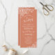 This beautiful wedding program features an elegant design with white text on a terracotta, coral, or light orange coloured background and lacy white curls and swirls in the corners. The titles are written in fancy script calligraphy, and there is space for your ceremony and wedding party details, as well as a short thank you for your guests. Wonderful way to welcome your friends and family to your wedding celebration.