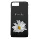 A Barely There iPhone 6 Plus Case with a photograph of an elegant white daisy with a yellow centre against a pure black background. Add your name name to this pretty flowers design.