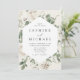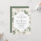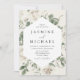 The elegant white floral wedding invitation features your names and wedding details framed by painted watercolor eucalyptus leaves, lush green foliage, white and cream roses, and lisianthus flowers.