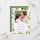 Elegant floral photo save the date card featuring hand painted watercolor white roses and greenery covering the entire front side. Your square picture and wedding details are on a white rectangular frame that overlaps the flowers. The backside is a matching shade of green and may be changed to any colour you wish. This design is perfect for a garden wedding in the summer.