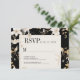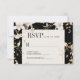 Elegant black and white wedding RSVP card depicts a beautiful romantic floral design with simple white flowers on a black background.. It features accepts, declines and number attending.