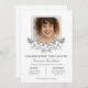 Floral memorial service or funeral invitation, featuring a photo of your loved one framed by a half wreath of white flowers and greenery.