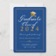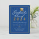 Announce your college graduation in style with this elegant custom class of 2023 graduate announcement card. This formal typography design features the words Graduate Class of 20XX with your degree, name, school, and date to personalise in gold and white script accented by a faux gold graduate cap and framed in gold on a royal blue background. The back of the card is royal blue. Designed by Susan Coffey.