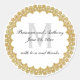 A very elegant white wedding sticker with black fancy text. A grey monogram is in the centre of the wedding sticker. The bride and groom names are overlaid in black with their wedding date. With love and thanks is written below in the same ornate text. A very fancy gold frame surrounds this design. Easy to customised.