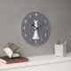 A clock with a classy gray background. Designed with an elegant white gown hanging down from a hanger. Simple minimalist design.