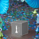 A tiny favour box (2 inch x 2 inch) made with a classy grey background. A graphic illustration of an elegant white gown hanging on a hanger. Simple minimalist design.