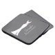 A laptop sleeve made with a classy grey background. A graphic illustration of an elegant white gown hanging on a hanger. Simple minimalist design.