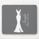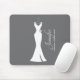 Personalised mousepad made with a classy grey background. A graphic illustration of an elegant white gown hanging on a hanger. Simple minimalist design.
