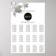 This design features white lily flowers. The beautiful elegant white lilies compliment the elegant black modern circle shape encircling the wedding date. A perfect fusion of modern and chic with green colour tones. Green, black and white are a perfect match for an elegant floral garden themed wedding. Unique wedding seating chart design with modern elements. Matching wedding invitations and other stationery items are also available.