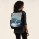 This Bold Face backpack with a interchangeable front face has an elegant white mother swan swimming in a pond with blue water along side her baby swan surround by trees.