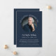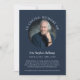 Modern memorial announcement in navy blue with white text featuring a round photo of your loved one and a tasteful wording design. In loving memory of announcement personalised with a photo. Elegant card to announce the passing of a loved one.