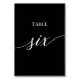 This elegant white on black calligraphy table six table number is perfect for a simple wedding. The neutral design features a minimalist card decorated with romantic and whimsical typography. The card prints on the front and back (double-sided). Other table numbers in the collection are sold separately.