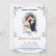 Indulge in opulence with our luxurious wedding invitation featuring an elegant couple's photo on a pristine white backdrop adorned by cascading blue, pink, and green blossoms. A timeless celebration awaits.