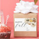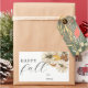 Custom-designed fall holiday gift box labels featuring "happy fall" with elegant watercolor white pumpkins design.