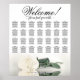 Introducing our stunning 28 table wedding seating chart, perfect for welcoming up to 280 guests with 10 seats per table. The classic and timeless floral design showcases a single long-stemmed ivory, white, or cream coloured rose lying on its side reflecting in water. The elegant script calligraphy title reads: Welcome! Please find your table, with space for the couple's names and wedding date below. This chart exudes romance, sophistication, and chicness, adding a touch of elegance to your wedding reception while making it effortless for guests to find their seats.