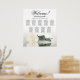 This exquisite wedding seating chart contains 9 tables and showcases a romantic design featuring a single long-stemmed ivory, white, or cream coloured rose resting on its side and reflecting in a pool of water. The title, "Welcome - please find your table," is displayed above the names of the couple and the date of the wedding. With seating arrangements for 90 guests and 10 seats per table, this chart provides ample space for guests to locate their seats with ease. The sophisticated, stylish, and chic design adds an element of grace and class to your wedding reception.