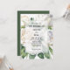 A simple, elegant wedding invitation featuring white roses and peonies and green leaves.