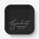 Elegant black graduation party paper plates featuring "Graduate" in a chic white script and the grad's name and class year in simple modern white typography.