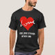 This black t.shirt features a large red hand drawn love heart featuring love in original elegant script. To change the text into a marriage proposal or cute message click on the personalise button.