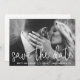 Modern photo save the date card with your full bleed horizontal picture featuring a typography overlay with the words, "save the date" in a thin white handwriting script font. Below is one line of text for your wedding details. The backside has the words, "invitation to follow" in the matching script and may be removed by clicking the "customise" button. A simple yet elegant design that makes your photo the main feature.