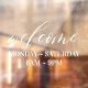 Elegant and minimal business store hours window cling. Design features "Welcome" design in an elegant white script-style font. Customise with your business store hours.