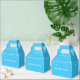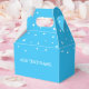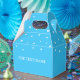 White star pattern on pastel blue background. Custom party favour boxes. Edit text to customise. Great for personalised party decor.